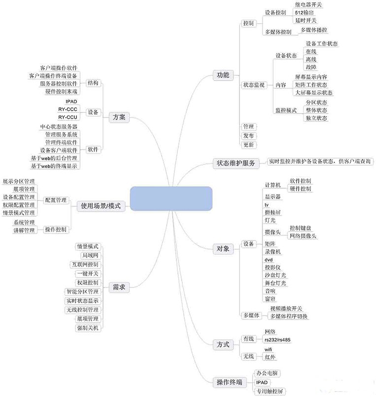展廳中控系統(tǒng)(中央控制系統(tǒng)、ipad控制系統(tǒng))是對(duì)展廳內(nèi)的聲、光、電等各種設(shè)備進(jìn)行集中控制的一套軟硬件相結(jié)合的系統(tǒng)。用戶可用移動(dòng)式控制面板、計(jì)算機(jī)顯示器、觸摸屏或無(wú)線遙控等設(shè)備,通過計(jì)算機(jī)和中央控制系統(tǒng)軟件來(lái)控制投影機(jī)、展示臺(tái)、燈光、影碟機(jī)、錄像機(jī)、卡座、功放、話筒、計(jì)算機(jī)、筆記本、電動(dòng)窗簾、電動(dòng)屏幕等設(shè)備。